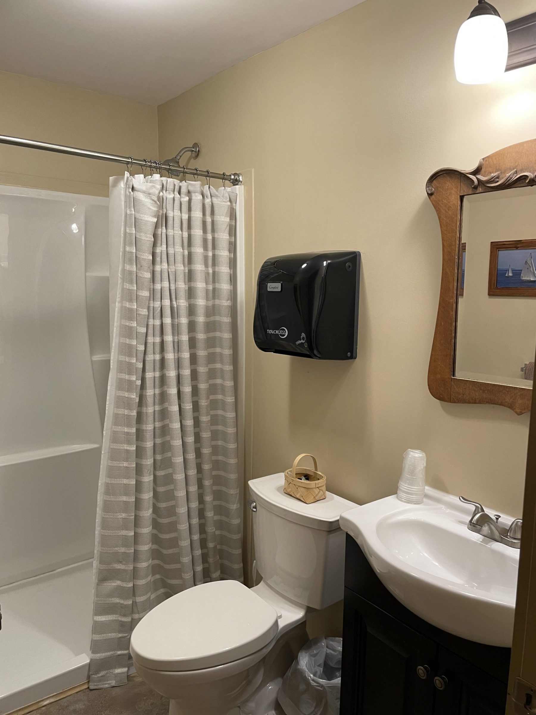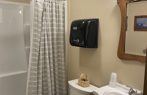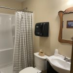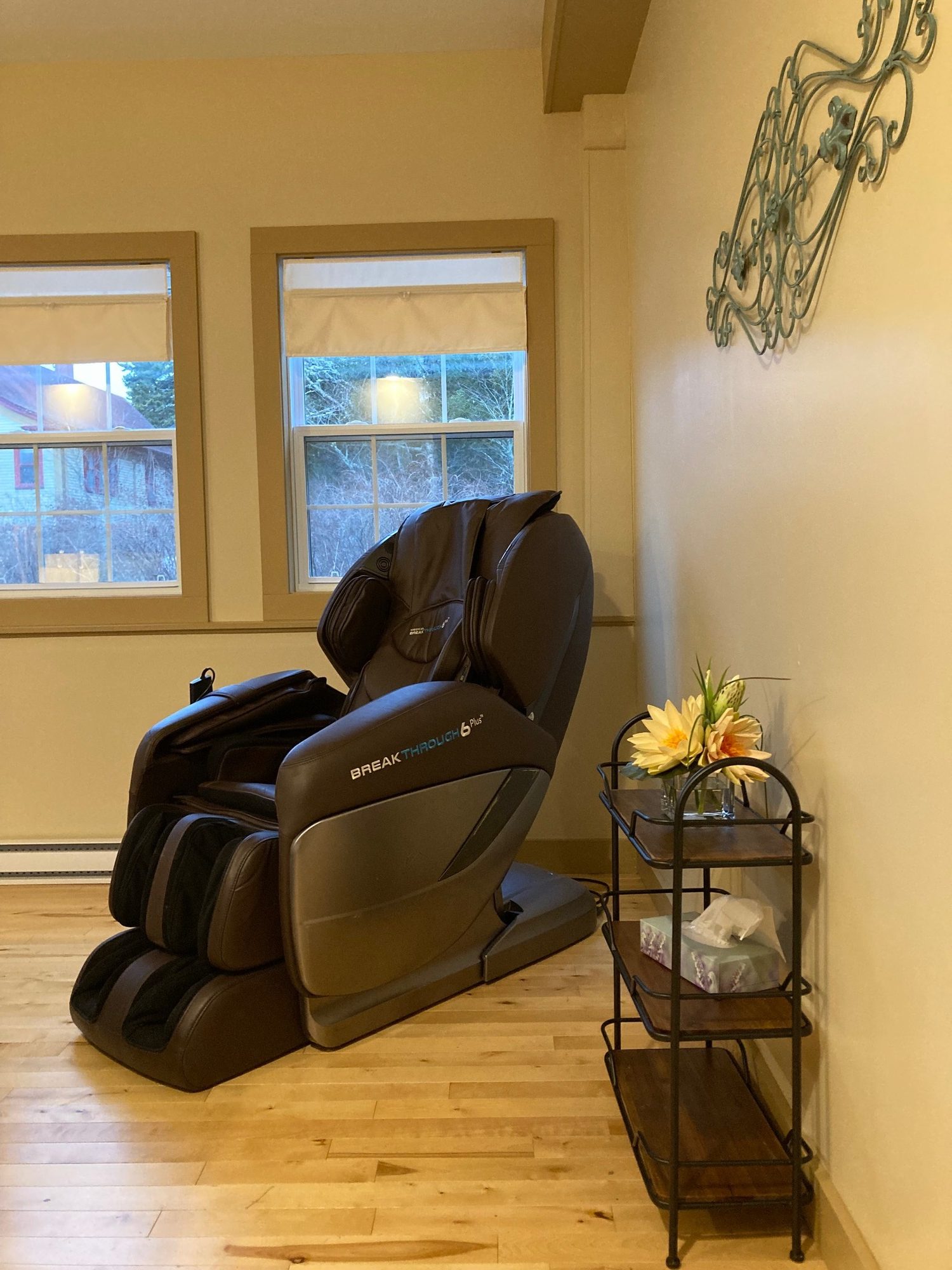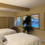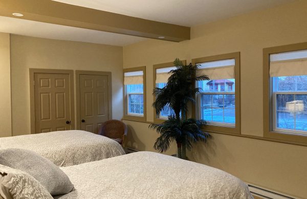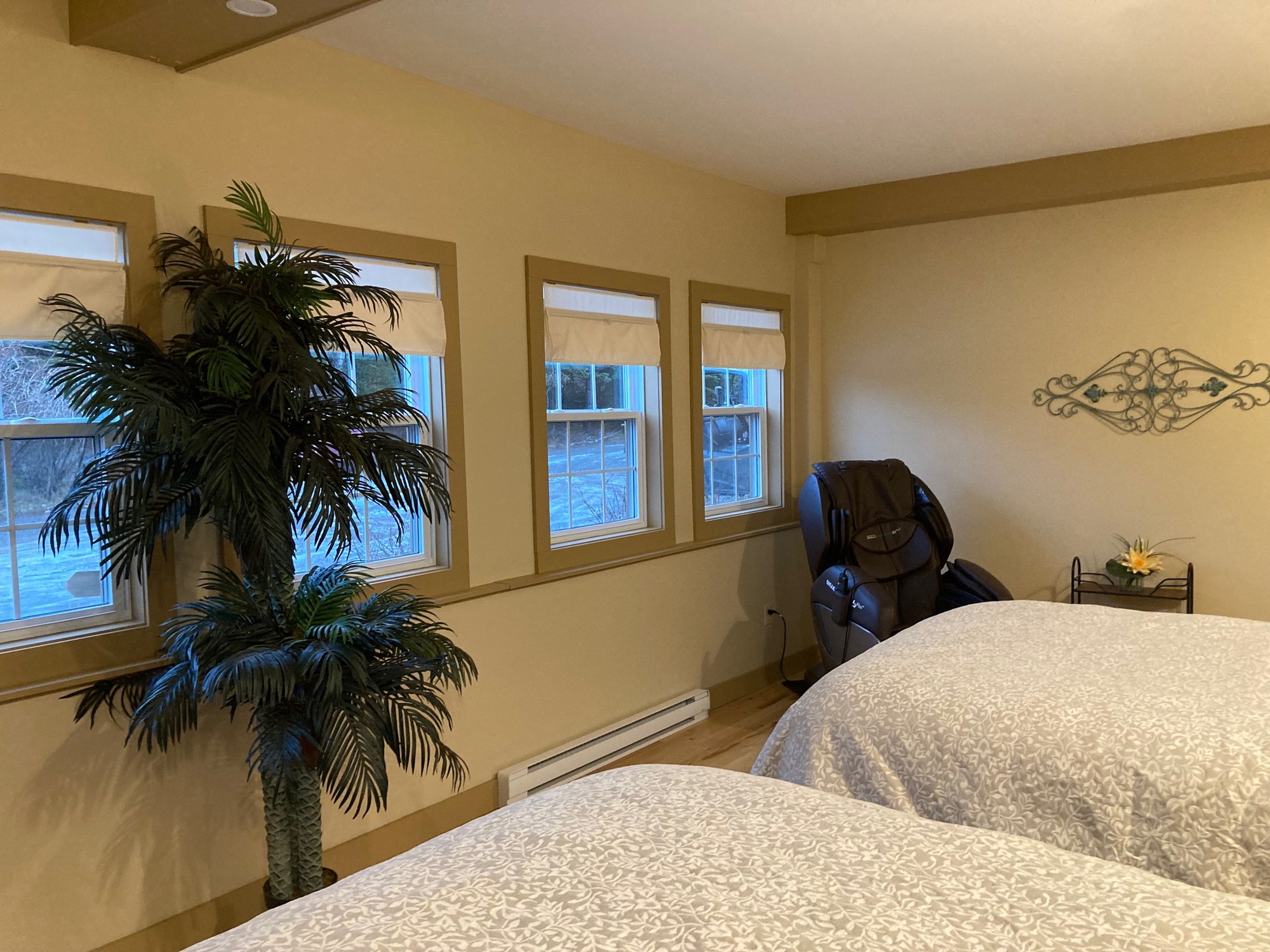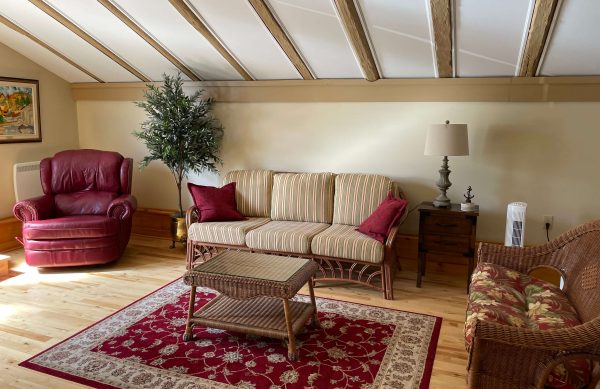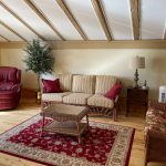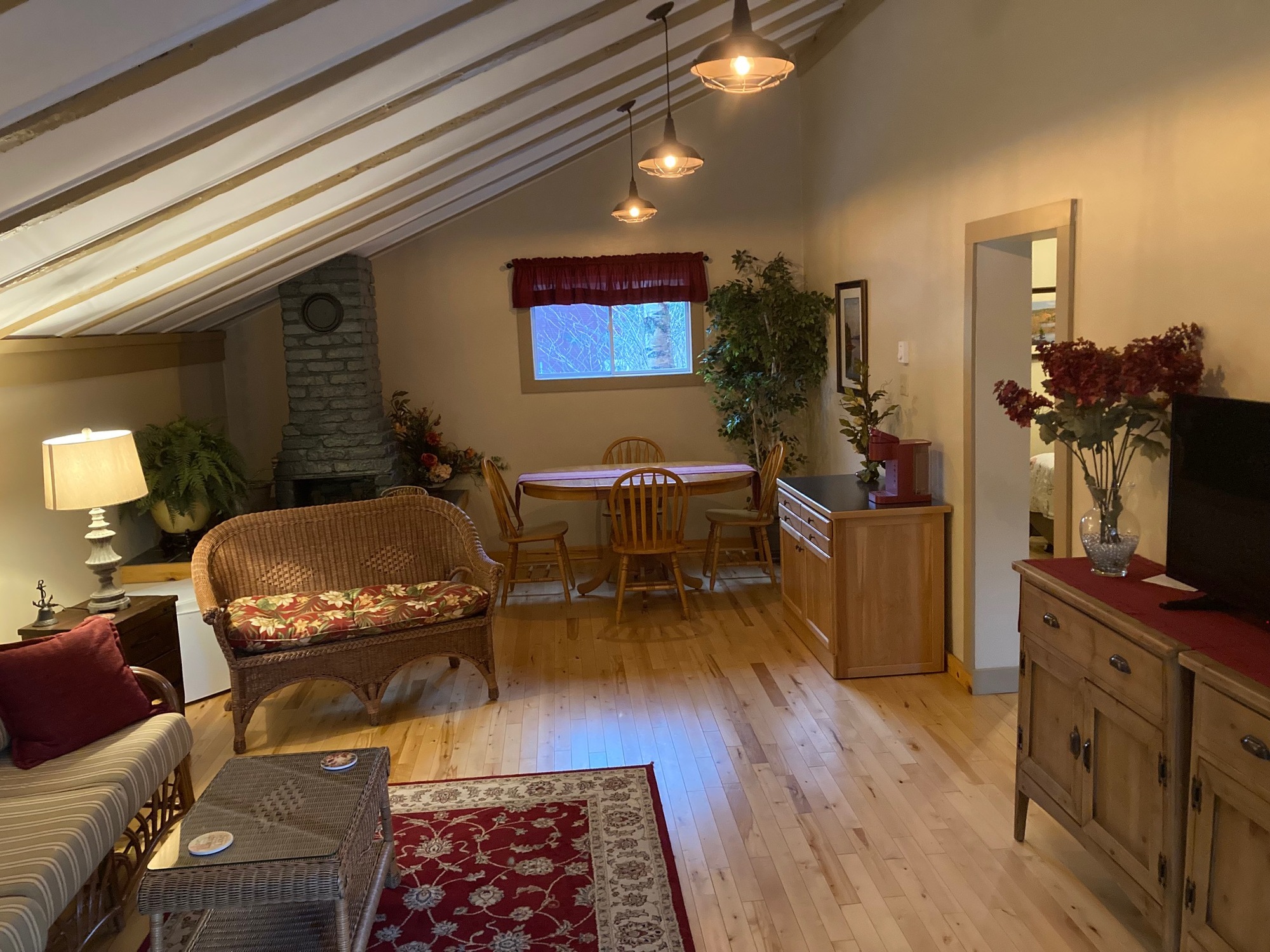 The large living room is in the former blacksmith shop that has the original furnace. There are sofas and comfortable chairs, a table for games, Smart TV, fridge and Kuerig machine. The main bedroom has a wall of windows, 2 queen size beds and a state-of-the-art massage chair (Medical Breakthrough 6 Plus). The bathroom has a walk-in shower. The second bedroom has a queen bed, ceiling fan and electric fireplace. Amenities include a hot tub, exercise room, fire pit, hiking trails, lawn games, picnic areas, coffee station, food and bar service. Breakfast is complimentary.