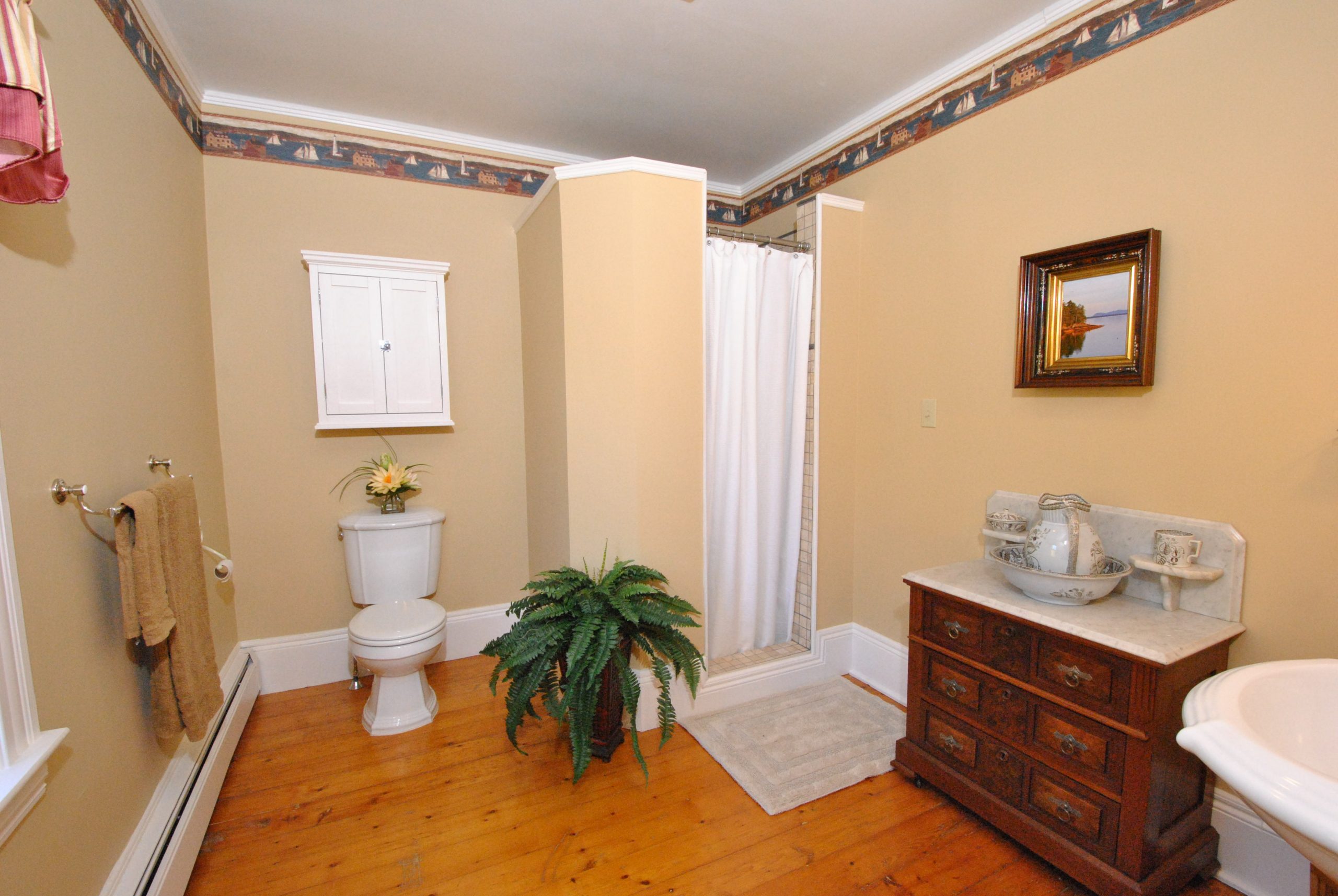This historic room overlooks the gardens. The large bedroom has a polished wood floor installed more than 150 years ago. French doors separate the king size bed from the sitting room, with a full size pull-out couch. The private bath is spacious with a large shower. The suite is air conditioned with a smart TV, WIFI and a fridge.