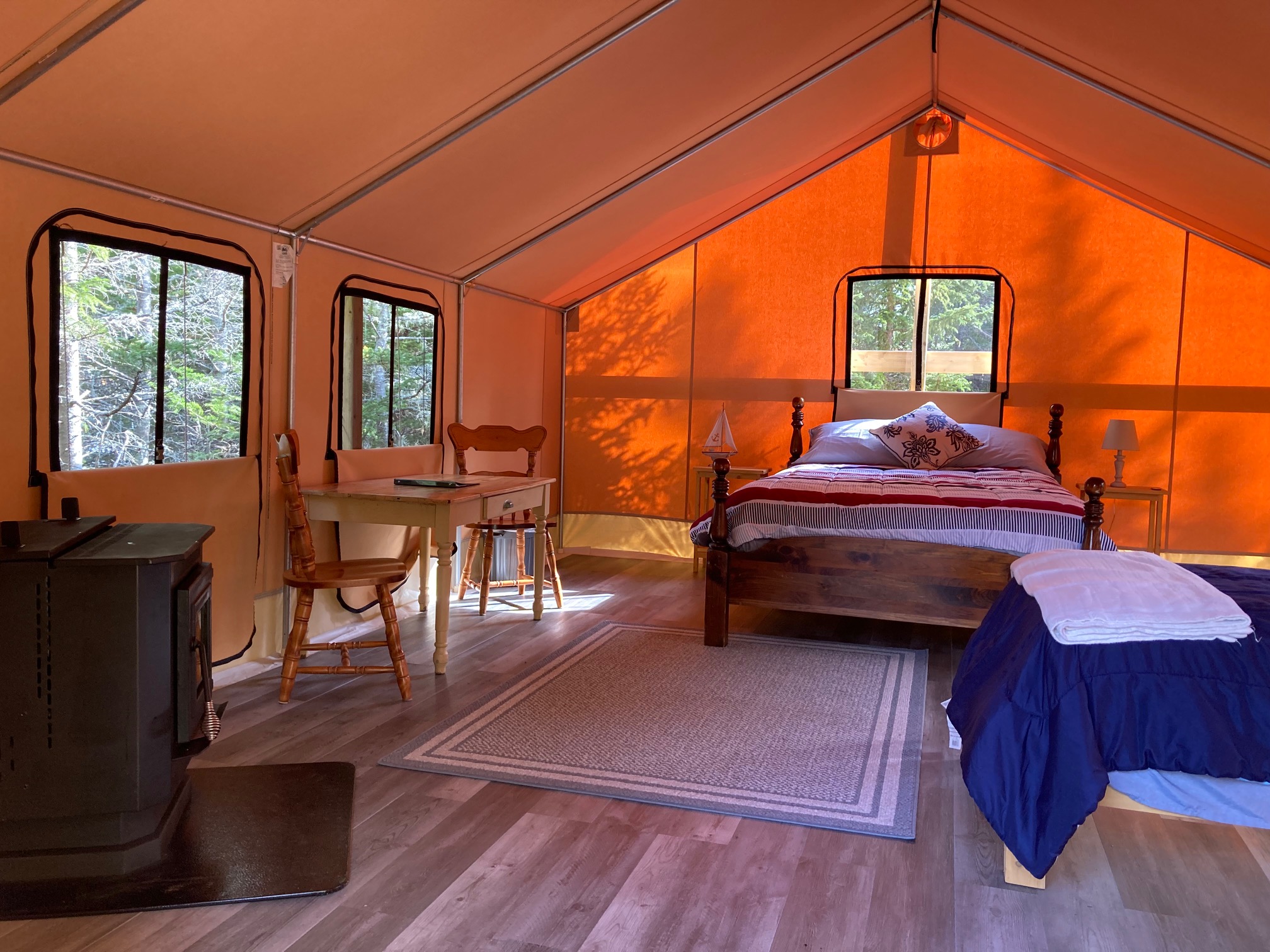 Our new Bell, Explorer and Safari glamping tents have a variety of sleeping options – queen, king, two queens, queen and a twin, queen and bunk beds — with soft mattresses and quality sheets, pine furniture, fans, electric lights, wood pellet stoves and heaters. The glamping tent platforms are in the trees, with a veranda, outdoor chairs and a small enclosure with a portable toilet and sink. A short walk takes you to a new building with showers and toilets in private bathrooms. There is an area for barbequing and outdoor dining. Our hot tubs under the stars are also nearby. (Reserve your private hot tub time on our website in advance of your arrival. See the scheduling app under “Activities”). Glamping is a far cry from the days of camping on air mattresses with sleeping bags!