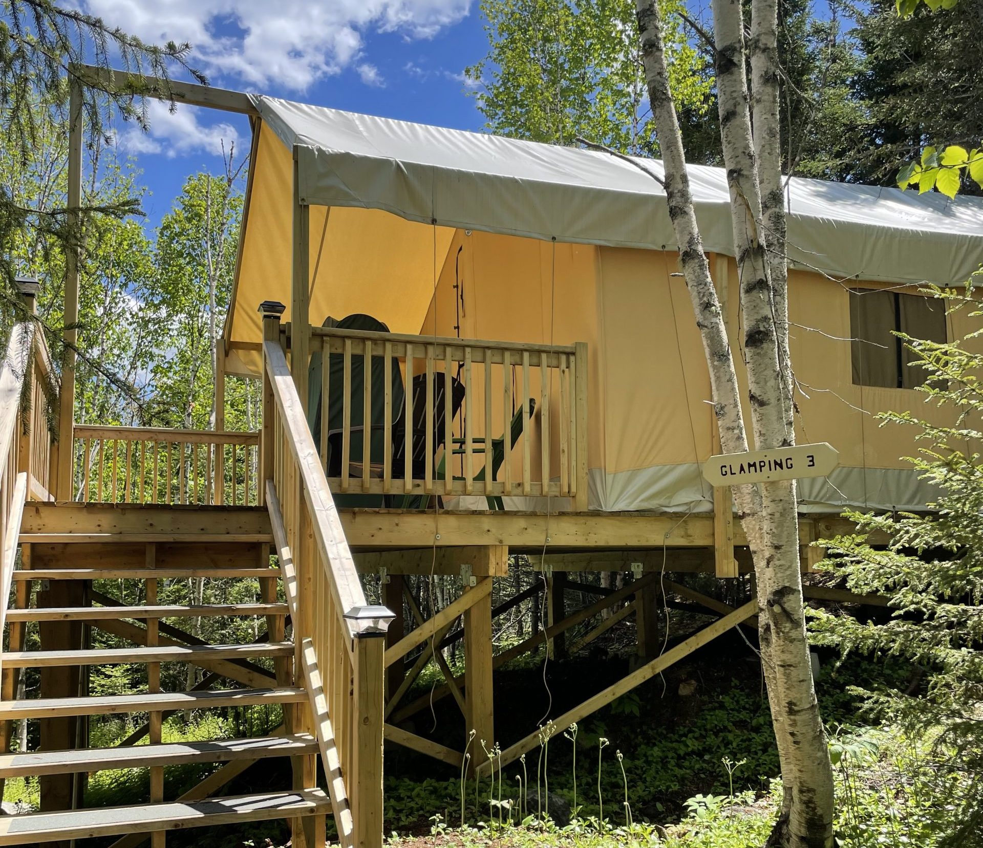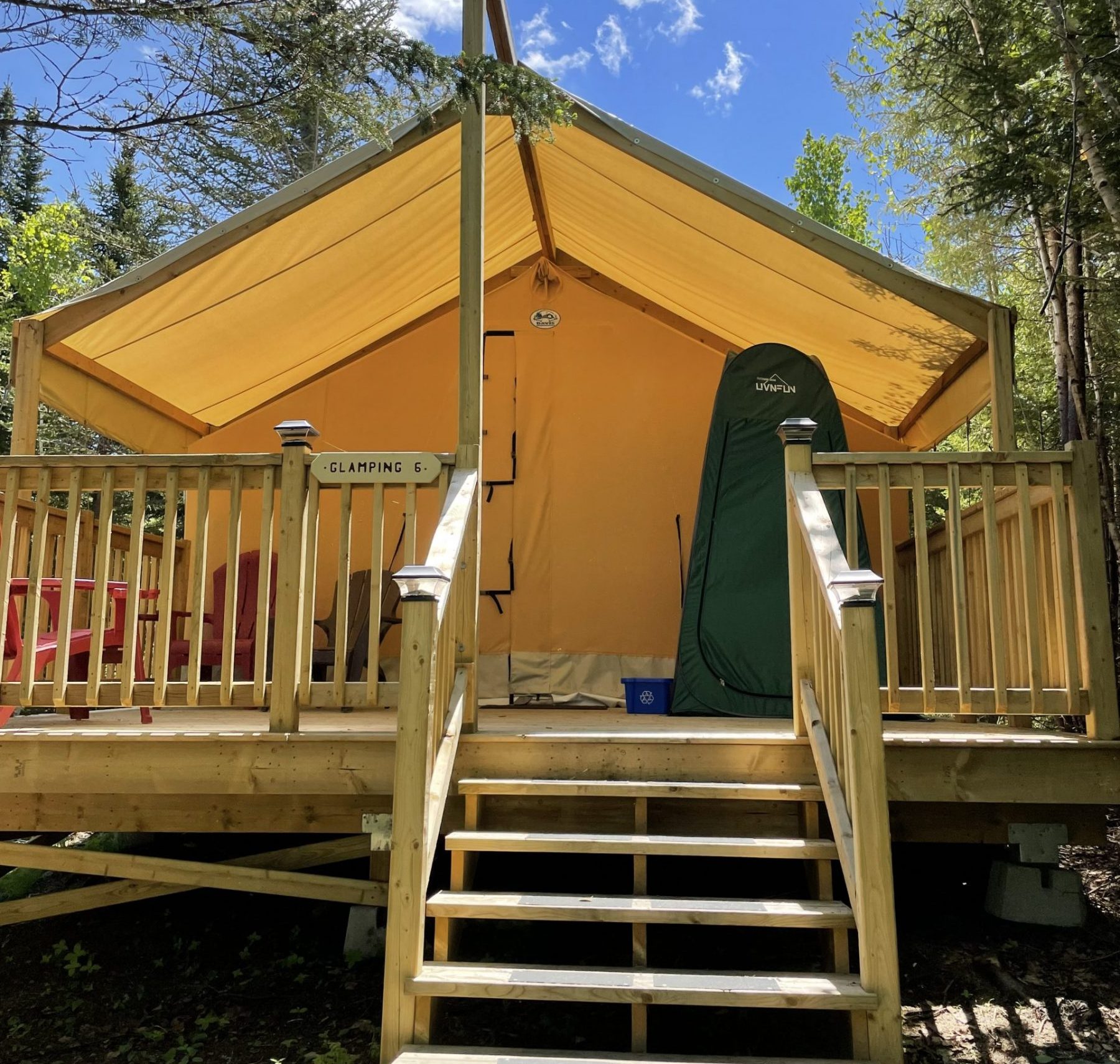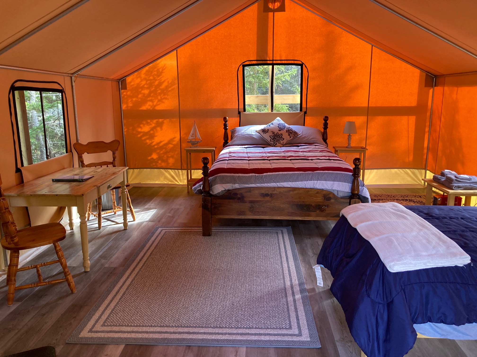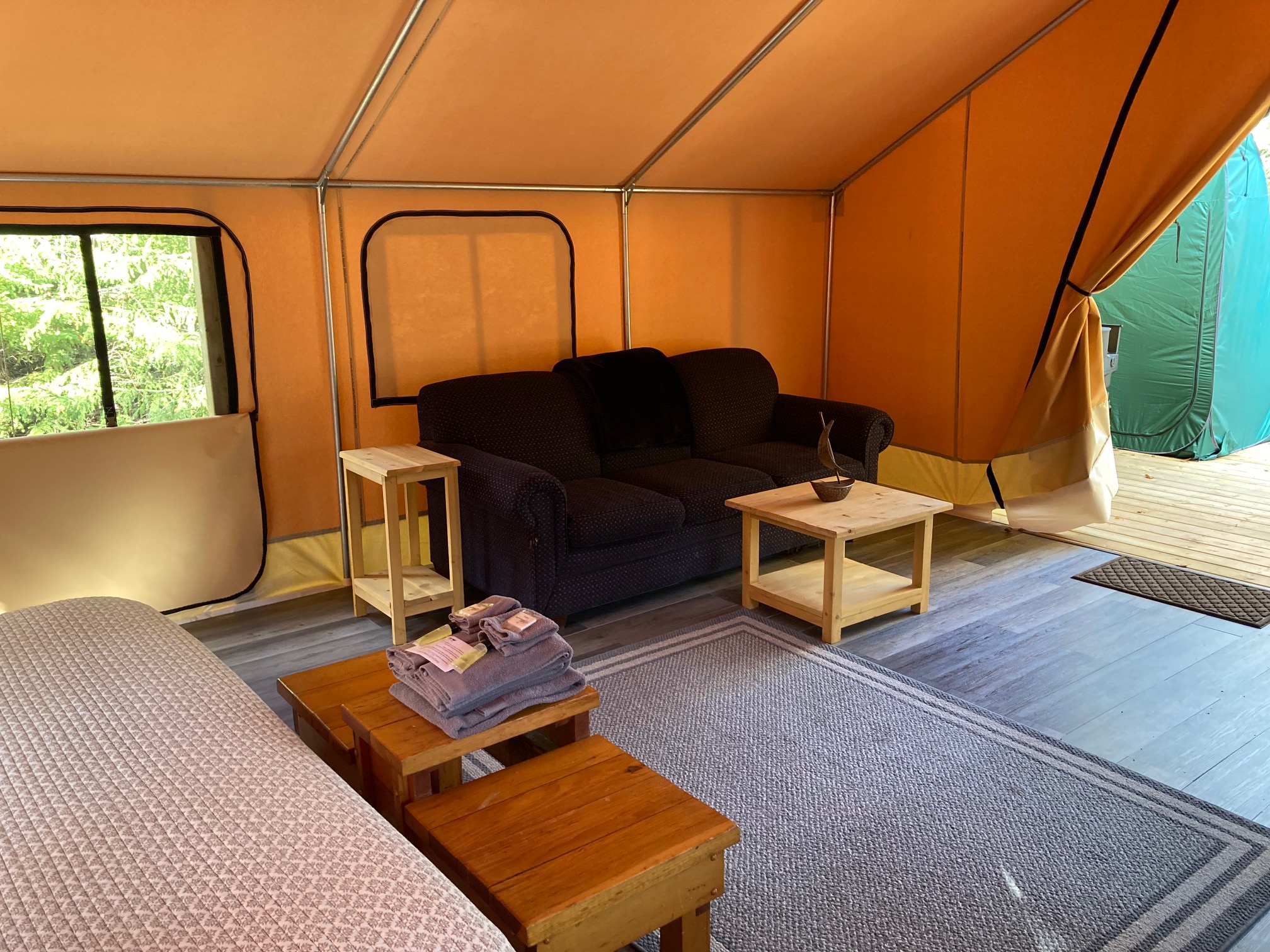 While we love your pets, and appreciate how much you want to have them share your glamping experience, there is a risk involved. If left inside a tent, or when something interesting is seen outside, a dog’s natural instinct is often to scratch at the screens. A damaged tent may have to be sent to the manufacturer in Denver, Colorado, and the cost of shipping, repair, and customs clearance can easily exceed $1000 – for even a small repair. This cost would be your responsibility. Never leave your pet alone inside a glamping tent.