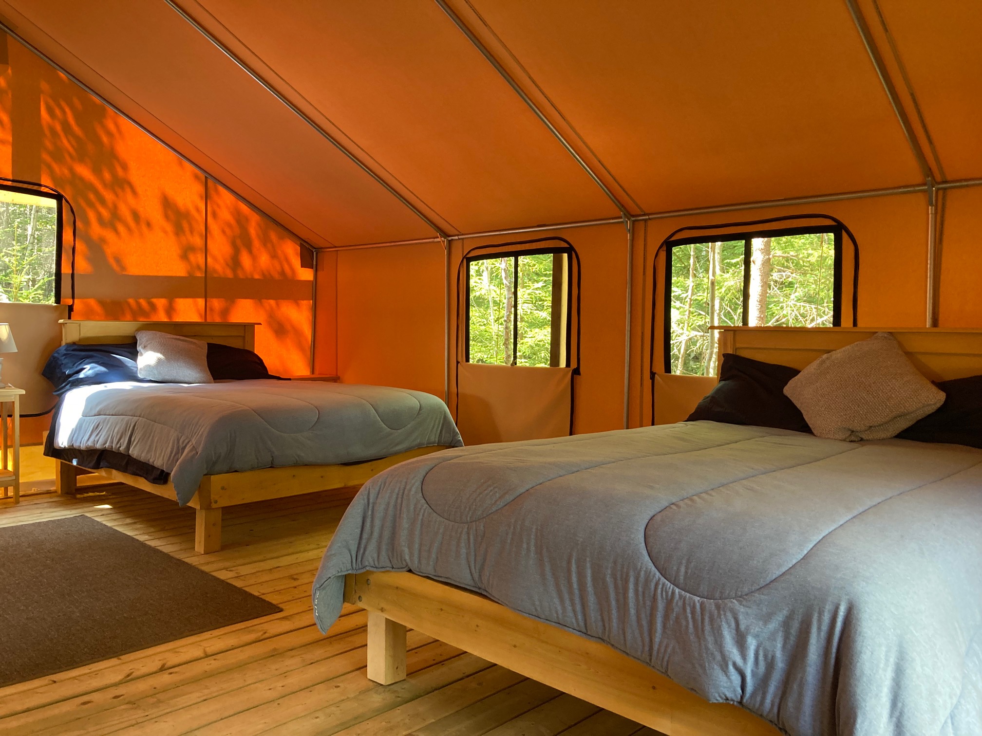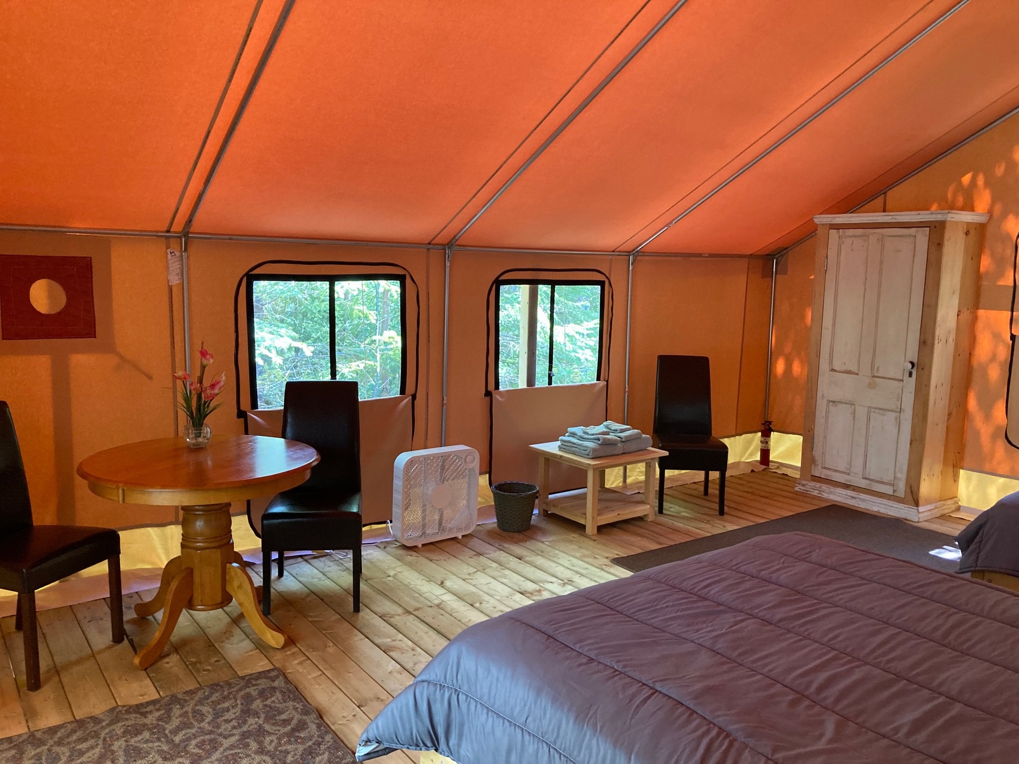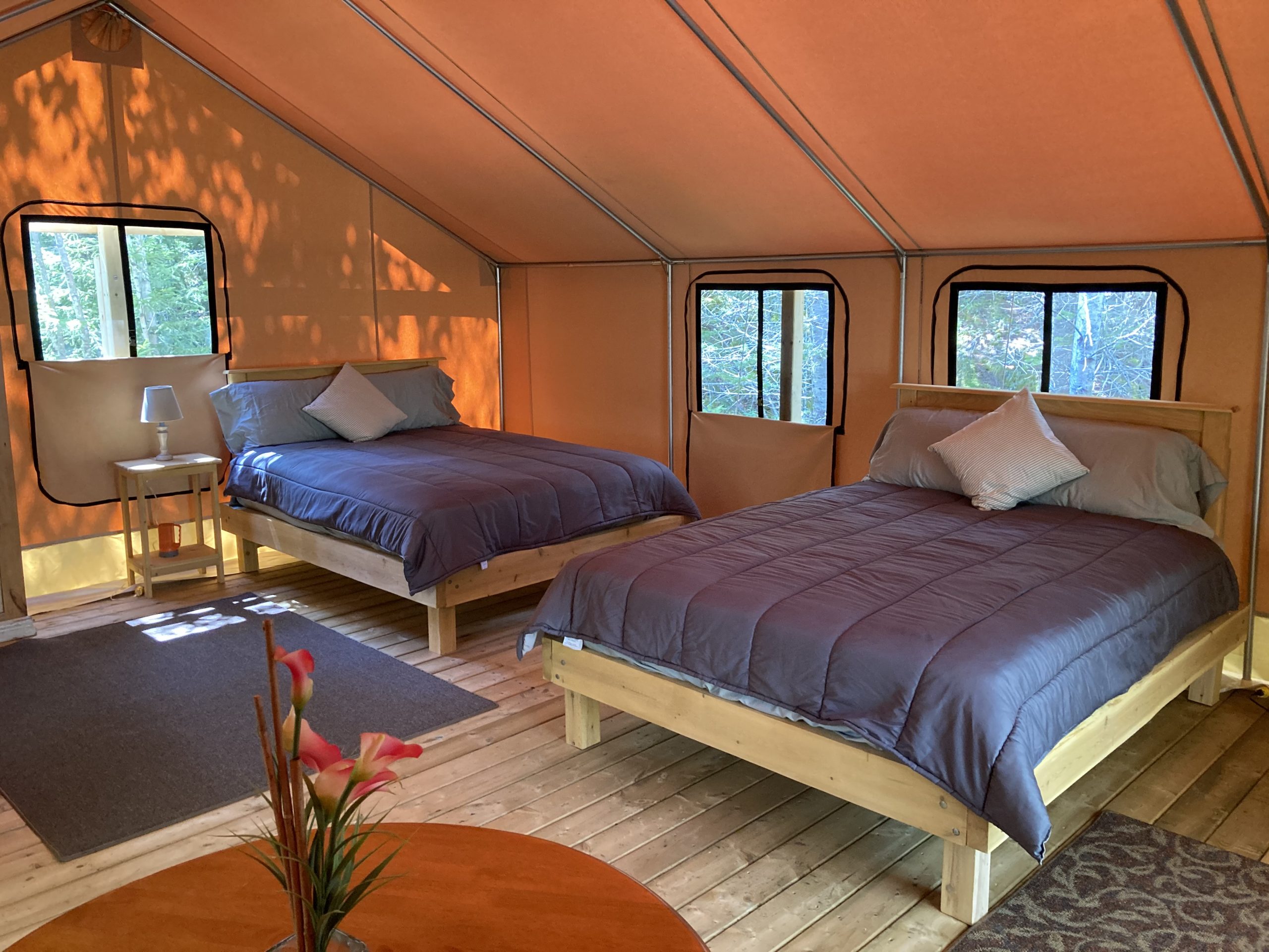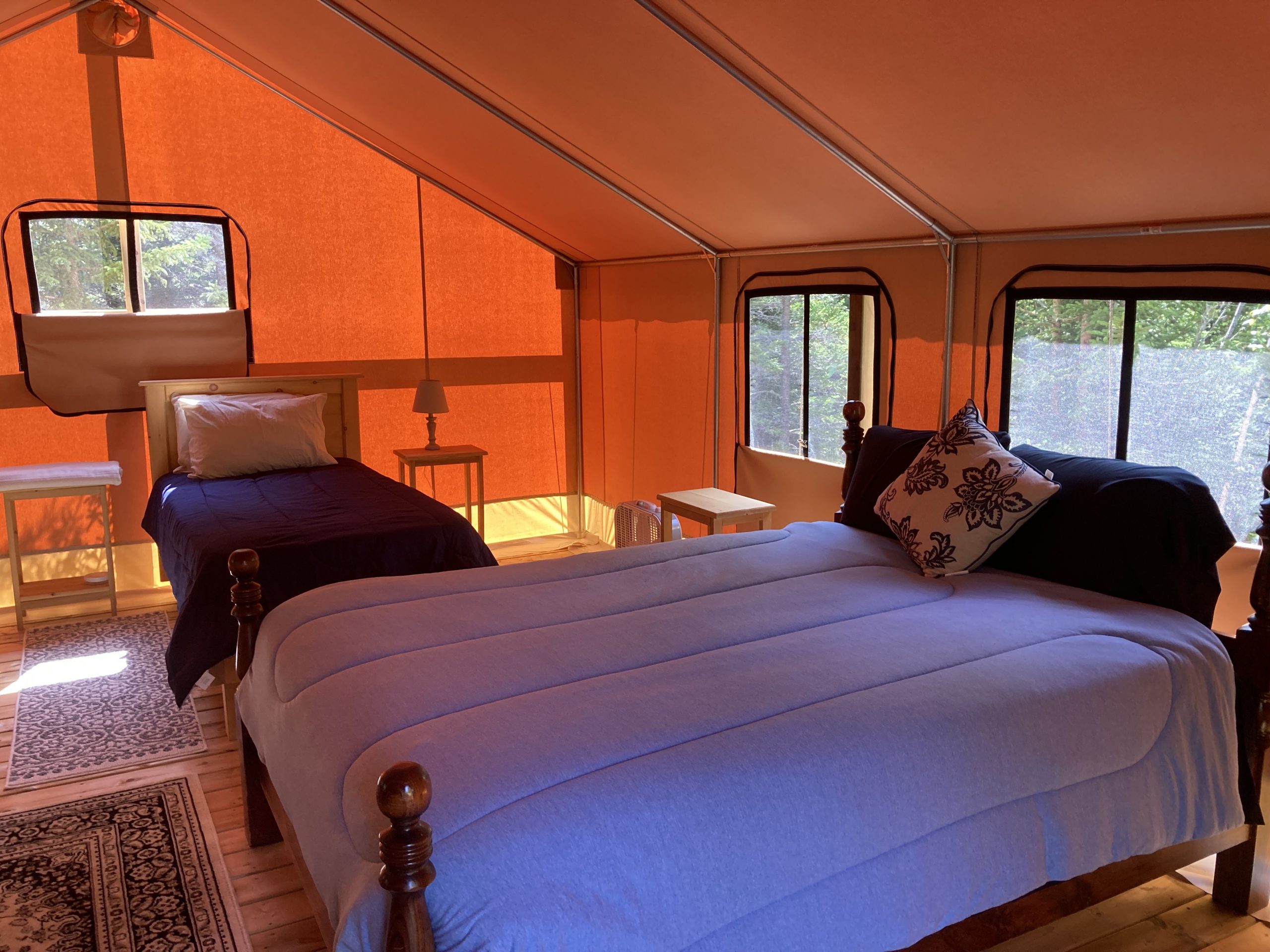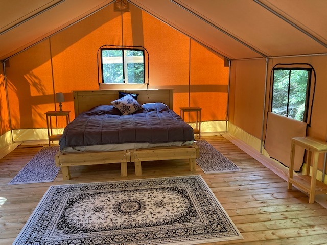 Our new Safari Tent has a queen-sized Bed with pillow-top mattresses and quality sheets, pine furniture, fan, and electric lights. There is a large raised veranda with outdoor chairs and a private enclosure with a portable toilet and sink. Additional bathrooms and showers are nearby at our Glampers Pavilion. Our hot tub under the stars is available for you to schedule your personal time. breakfast is complimentary, and there is a barbecue and picnic tables for your use. The glamping sites are on the side of Dominion Hill, letting you experience nature in privacy– with most of the comforts of home!